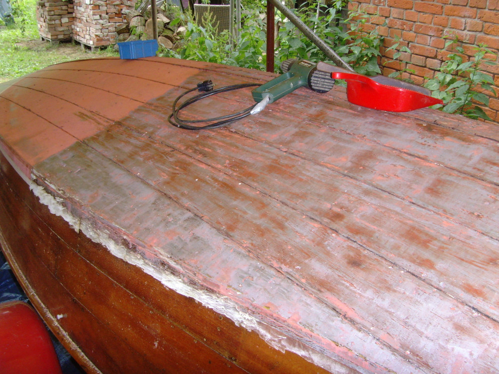 Heute war die Farbe auf dem Rumpf dran, wie man sieht, geht es voran, mit Heißluftföhn, Spachtel und viel Geduld.