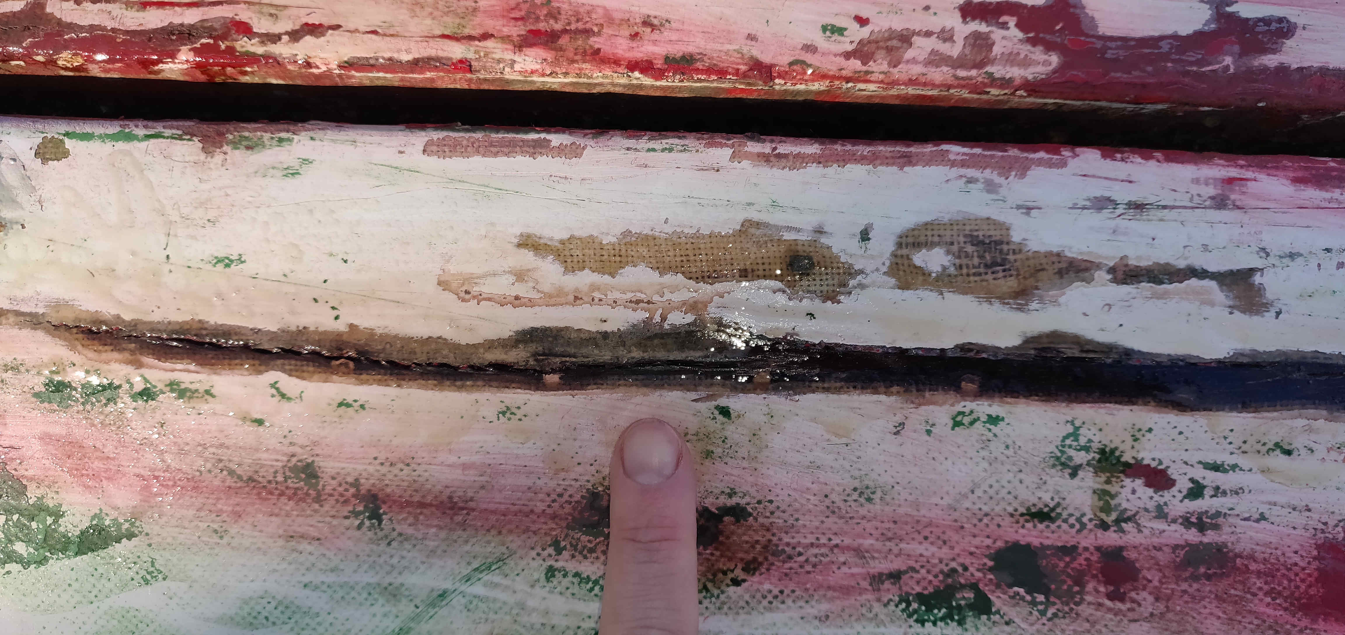 Die Lücken sind inzwischen mit epoxy und oder epoxy Spachtel verfüllt worden. Oben drauf Glasfaser Streifen und Abreißgewebe.