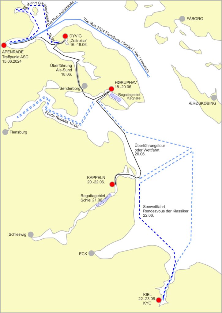 die Route für die Classic Week 2024 ist veröffentlich und insbesondere der erste Teil von Apenrade (DK) über Dyvig nach Höruphavn (DK) ist auch für Piratenjollen sehr gut zu segeln.
