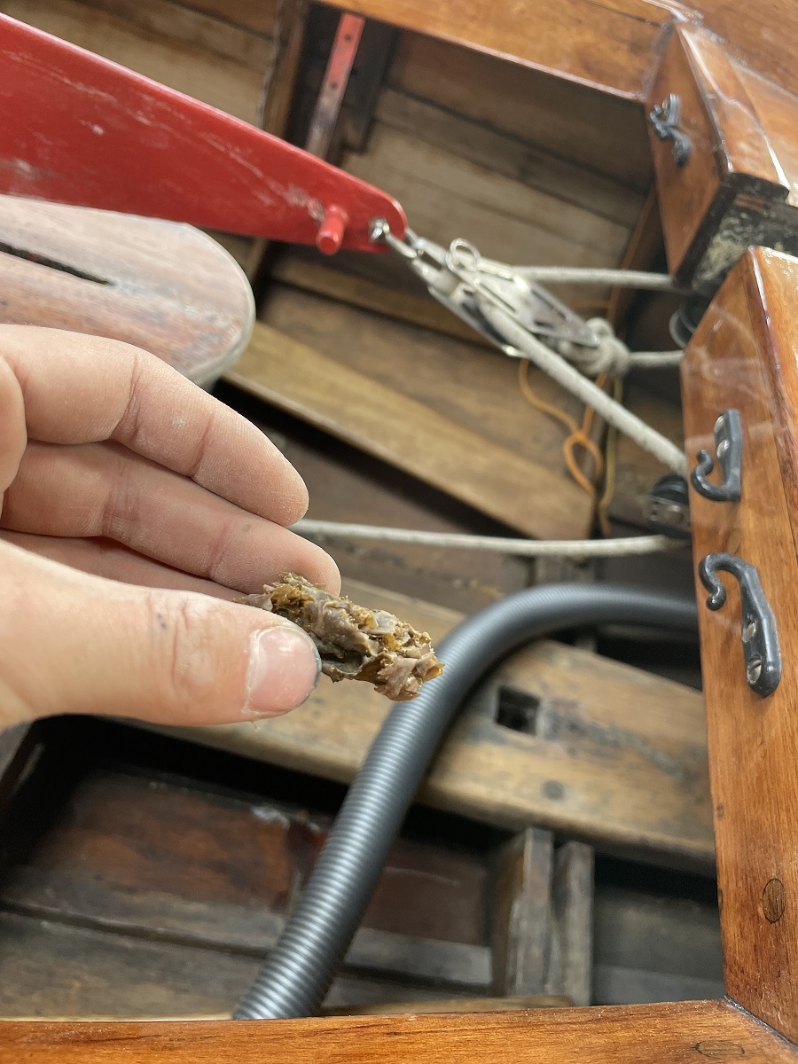 Zudem ist gerade das Bb Pütting ausgebaut.. war völlig unseetüchtig und wäre mir auf dem nächsten Törn um die Ohren geflogen. Das ganze Boot ist aber altersbedingt eine Bastelbude - nach einer langen Saison ist das Sperrholzdeck im Bereich der Püttinge meist  feucht unter dem Lack, das passiert mir immer  Confused