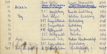 Dort ist zu lesen das er wohl mal beim Seesportklub Babelsberg stationiert war. Ich weiß nun nicht was die Herkunft ist.Ich denke aber das Brandzeichen am Schwertkasten ist die wirkliche Kennung. Vielleicht haben die Segel gewechselt.