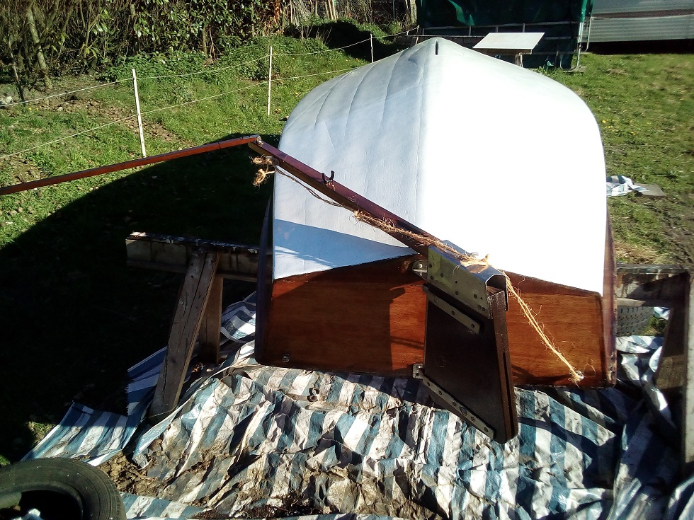 Die nächsten Schichten sind drauf, sowohl das Weiß wie das Klar. Letzteres nun etwas mehr verdünnt gemäß gutem Tipp eines freundlichen Mitschwimmers hier. Á propos Schwimmen: Geschwommen ist der kleine Enterer in meiner Legislaturperiode noch gar nicht. Wie das wohl mit der Steuerei klappt.....Habe zum Lackieren von Ruderoberteil und Pinne ersteres mal eingehängt; wie soll man damit steuern? Da muss ich ja später immer unter das Boot greifen..... Rolleyes