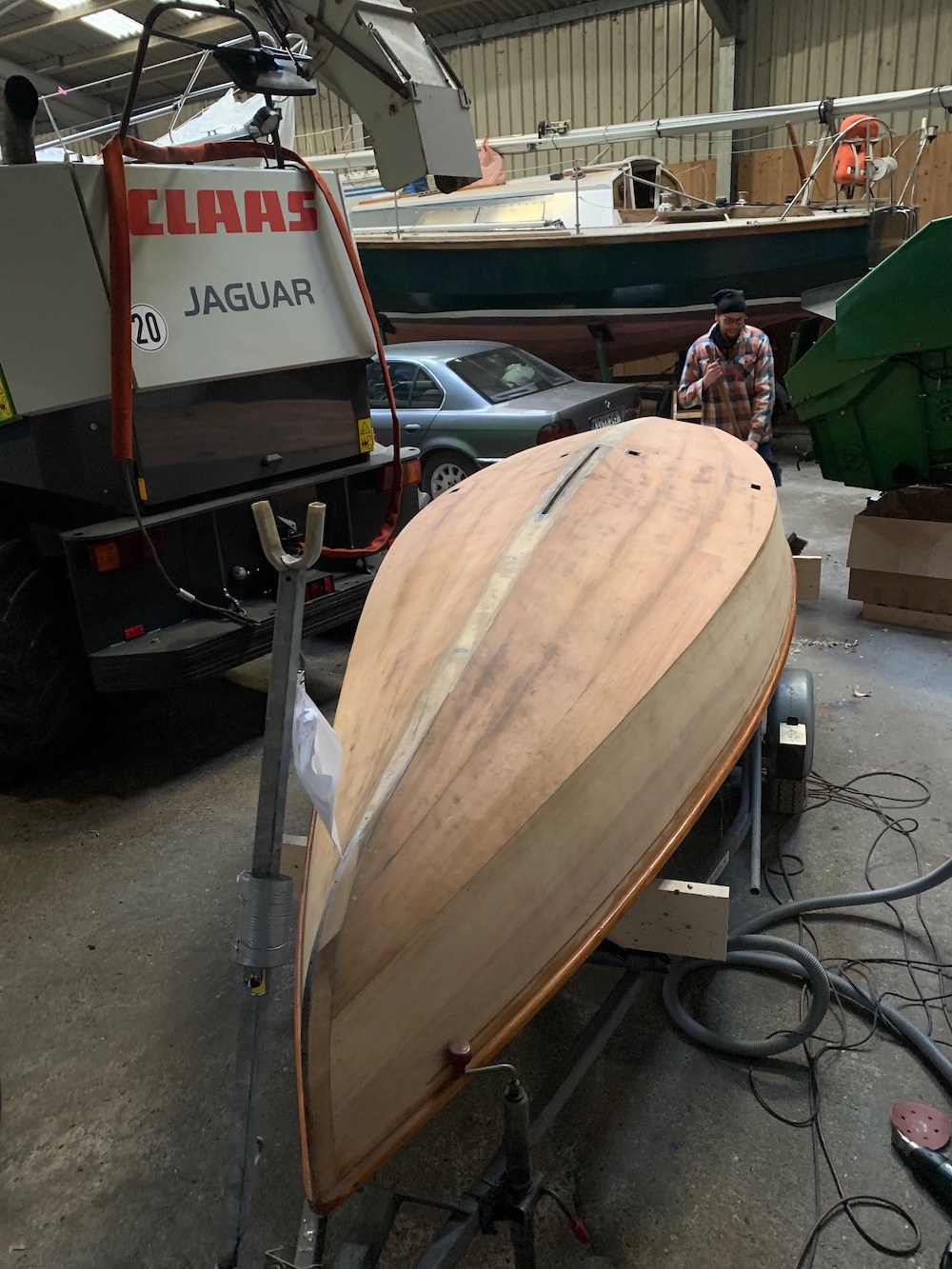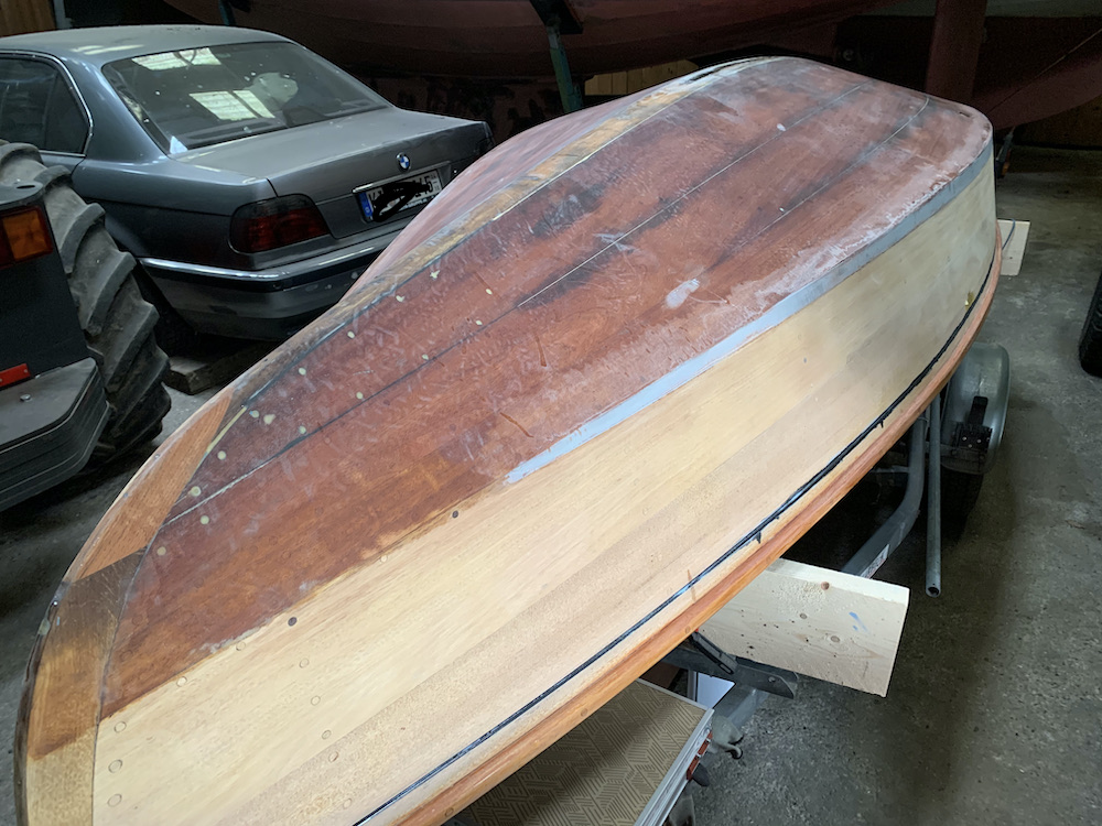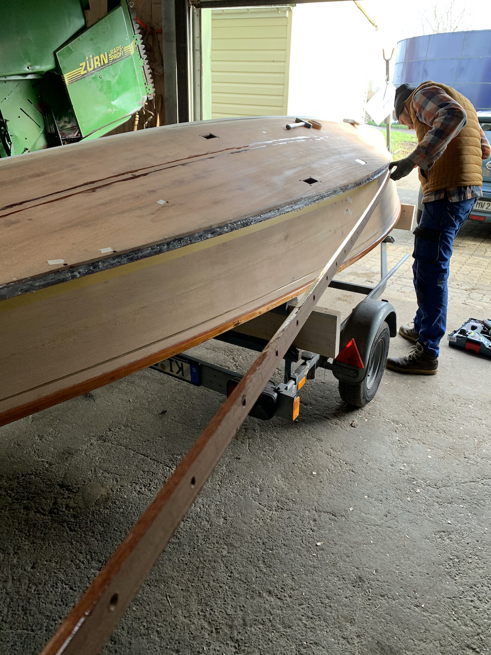 GER841 - ROXANNE (Ex- "Aupriel", Ex- "Hutschefidel") - GER841 - Jörg - 16.12.2020 Moin zusammen, wir sind seid letztem Juni stolze Besitzer des Piraten mit der Segelnummer GER 841. Gebaut wurde er 1953 als Einzelbau von/für Martin von Cölln in Hamburg und hat mit unserem Kauf zum ersten Mal einen Besitzer außerhalb der Hansestadt und zwar ist der neue Heimathafen der Olympiahafen in Kiel-Schilksee. Auch wenn wir gerne an Booten arbeiten (der Vorschoter ist Bootsbaumeister) war es uns wichtig, dass wir sofort segeln können und dafür war dieses Boot nahezu perfekt. 2004 wurde der Pirat auch einmal sehr aufwendig restauriert und seid dem regelmäßig gepflegt. Da wir in Kiel aber so spontan keinen Wasserliegeplatz mehr erhalten konnten, hatten wir durch das Stehen an Land doch etwas mit Wasser im Boot zu kämpfen. Haben dies aber mit nassen Handtüchern und Fassdichte von Toplicht (Tipp kam aus diesem Forum) unter Kontrolle bekommen. Werden in diesem Winter aber trotzdem einmal komplett das Unter- Überwasserschiff abziehen und ihn zu einem vollfertigen Landlieger umwandeln. (Keine Angst es wird keinen Leichentuch geben ) und um zu schauen ob nicht doch irgendwo etwas im argen ist. Ziel ist es in den nächsten Jahren auch einmal am Holzpiraten Festival und anderen Holzbootregatten teilzunehmen. Dann auch mit neuem Namen ![]() Viele Grüße Jörg Hier noch ein paar Fotos u.a vom Messbrief, der Restaurierung in 2004 und der aktuellen Arbeit (Stand 16.12.2020). RE: GER841 (Ex- "Aupriel", Ex- "Hutschefidel") - Ilex - 19.12.2020 Hallo Jörg! Hab in den letzten Tagen auch unseren Piraten abgezogen. Dein Pirat hat schöne breite Planken. Was machst Du auf das Unterschiff? LG, Harm Hallo, nochmal! Ich suche immer noch einen Trailer für unseren Ilex. Neulich hätte ich fast einen originalen aus den 60ern bekommen LG, Harm RE: GER841 (Ex- "Aupriel", Ex- "Hutschefidel") - GER841 - Jörg - 20.12.2020 Moin, im Unterwasserschiff werden wir 1) Kimm mit 1 Lage Matte und Epoxi versiegeln 2) Epoxianstrich im gesamten Unterwasserschiff 3) 2k- Grundierung Perfection von International 4) 2K- Lack in Schwarz von International 5) Bei Rissen die sich bilden werden wir wieder Ettan Nahtwachs von Toplicht einsetzen Über der Wasserlinie werden wir Owatrol D1 und D2 verwenden. Übrigens hat sich wie befürchtet/erhofft beim Abziehen auch eine marode Stelle an der Kimm sichtbar. Diese haben wir jetzt großflächig freigelegt und werden sie die nächsten Tage wieder mit einer Mahagoni Leiste ersetzen. Auch am Spiegel musste wir leider etwas mehr Arbeit investieren und ein "Verkleidung" abnehmen, da diese nicht richtig verklebt war. War aber nur Deko und wird nicht ersetzt. Beste Grüße aus Kiel RE: GER841 (Ex- "Aupriel", Ex- "Hutschefidel") - Wastl - 21.12.2020 Saubere Arbeit ! Und danke für die Bilder. Ich hoffe natürlich da kommt noch mehr. Gruß, Wastl RE: GER841 (Ex- "Aupriel", Ex- "Hutschefidel") - GER841 - Jörg - 26.01.2021 Hier ein kleines Update: Trotz der doch unangenehmen Temperaturen und der teils etwas beengten Platzverhältnisse kommen wir gut voran. Die Leiste ist ersetzt und die Epoxidschicht aufgetragen. Um gleich eine ausreichende Schichtdicke zu erreichen, haben, wir Abreisgewebe verwendet. Die erste Runde "Spachteln und Schleifen" ist auch schon durch. Aktuell liegen wir somit gut im Zeitplan für das Ansegeln am 15. März. Dann macht der Hafen wieder auf und hoffentlich lassen es die Einschränkungen und das Wetter zu. P.S. der neue Name steht jetzt auch schon zu 99% fest. RE: GER841 (Ex- "Aupriel", Ex- "Hutschefidel") - steffen - 28.01.2021 Hej Jörg, das sieht ja nach richtig guter Arbeit aus bei euch! Sehr schön! Habt ihr das Unterwasserschiff komplett 1x überzogen? Bis an den Knick und nicht noch darüber ein Stück? Konnte es nicht richtig erkennen. Ich habe es ja bereut, Abreissgewebe dafür verwendet zu haben, würde das beim nächsten Mal lieber wieder ohne machen. Die Schichtdicke habe ich vom Gefühl her besser ohne diese gleichmäßiger hinbekommen. Habe mich über die sehr weit aussen am Knick befindlichen alten Holzdübel gewundert bei euch. Deutet das vielleicht darauf hin, daß die Seiten schon sehr weit runter geschliffen sind? Oder der Bootsbauer hat die von Anfang an so weit raus gesetzt. Das ist wahrscheinlicher. Lasst ihr die Lenzklappen drin? Halte das bei den alten Booten für eine anfällige Stelle. Das Heck sieht ja ohne Furnier drüber richtig gut aus! Und bemerkenswert finde ich auch wie dicht die beiden Seitenplanken noch aneinander sind, anscheinend ohne die kleinste Fuge! Super! Macht weiter so gute Arbeit und viel Spaß dabei! (wie das so eben geht bei kaltem Wetter ;-)) RE: GER841 (Ex- "Aupriel", Ex- "Hutschefidel") - GER841 - Jörg - 07.02.2021 Moin Steffen, danke für das Lob. Sind bis jetzt auch echt zufrieden. Haben heute die 2. Schicht 2k-Grundierung aufgetragen. Der Knick ist mit 10cm breiten Glasfasergewebe überzogen. 5cm in beide Richtungen. Der Rest vom Unterwasserschiff ist rein mit Epoxy beschichtet und hier haben wir das Abreissgewebe genutzt. Ging auch echt gut. Bei den Dübeln ist es glaube ich eine Mischung aus beiden Theorien. Auf der Backbordseite gab es einmal einen Schaden. (Boot ist unter einen Steg getrieben) und das Boot ist das ein paar mm schmaler. Die halben Dübel befinden sich aber am ganzen Boot. Haben bei den Lenzklappen auch länger diskutiert, aber haben uns aber Ende doch für das drin lassen entschieden, da wir das Wasser sowohl an Land (die Mittleren) als auch auch unter Segeln schnell und unkompliziert raus bekommen wollen. Das Holz sieht da auch noch Topp aus. Diese Woche kommt dann endlich die erste Schicht Lack rauf 2K-International Perfektion im Farbton "Jet Black". ___>>>/)____ Weiter Fotos folgen. Schönen Wochenstart. RE: GER841 (Ex- "Aupriel", Ex- "Hutschefidel") - steffen - 08.02.2021 Guten Morgen mitten im Winter, man soll ja am besten gar nicht raus bei dem Wetter.... hier sind minus 10°. Im Auto liegen die L