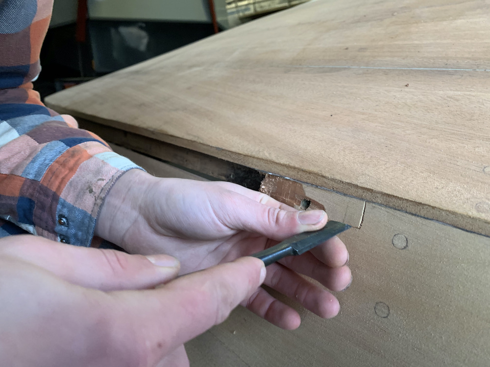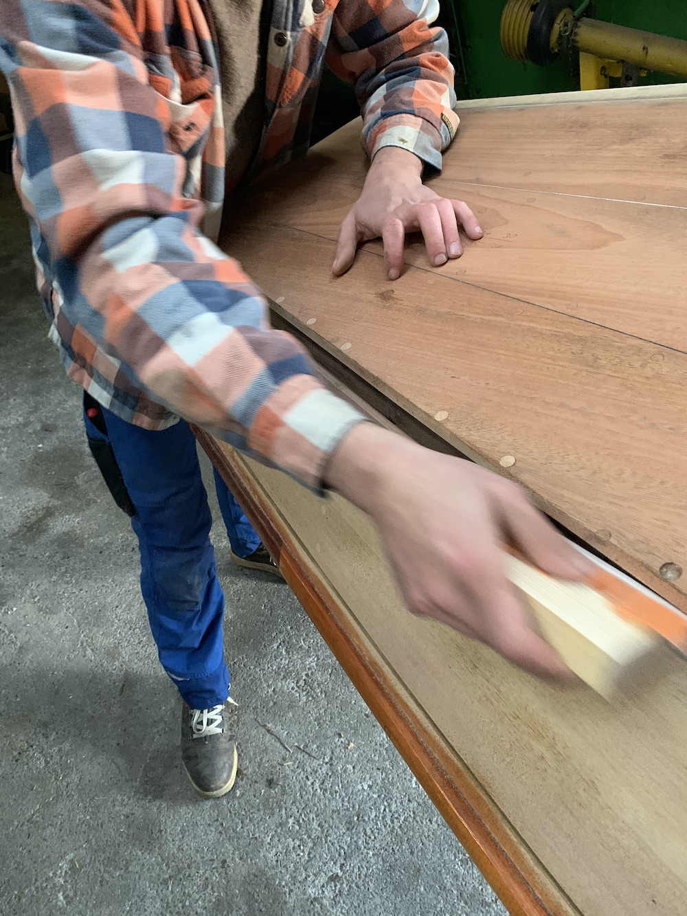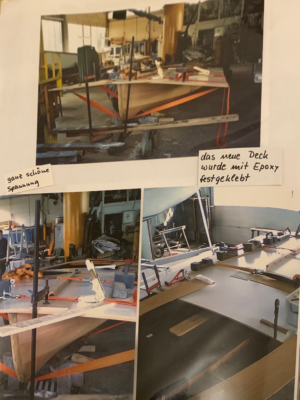 GER841 - ROXANNE (Ex- "Aupriel", Ex- "Hutschefidel") - GER841 - Jörg - 16.12.2020 Moin zusammen, wir sind seid letztem Juni stolze Besitzer des Piraten mit der Segelnummer GER 841. Gebaut wurde er 1953 als Einzelbau von/für Martin von Cölln in Hamburg und hat mit unserem Kauf zum ersten Mal einen Besitzer außerhalb der Hansestadt und zwar ist der neue Heimathafen der Olympiahafen in Kiel-Schilksee. Auch wenn wir gerne an Booten arbeiten (der Vorschoter ist Bootsbaumeister) war es uns wichtig, dass wir sofort segeln können und dafür war dieses Boot nahezu perfekt. 2004 wurde der Pirat auch einmal sehr aufwendig restauriert und seid dem regelmäßig gepflegt. Da wir in Kiel aber so spontan keinen Wasserliegeplatz mehr erhalten konnten, hatten wir durch das Stehen an Land doch etwas mit Wasser im Boot zu kämpfen. Haben dies aber mit nassen Handtüchern und Fassdichte von Toplicht (Tipp kam aus diesem Forum) unter Kontrolle bekommen. Werden in diesem Winter aber trotzdem einmal komplett das Unter- Überwasserschiff abziehen und ihn zu einem vollfertigen Landlieger umwandeln. (Keine Angst es wird keinen Leichentuch geben ) und um zu schauen ob nicht doch irgendwo etwas im argen ist. Ziel ist es in den nächsten Jahren auch einmal am Holzpiraten Festival und anderen Holzbootregatten teilzunehmen. Dann auch mit neuem Namen ![]() Viele Grüße Jörg Hier noch ein paar Fotos u.a vom Messbrief, der Restaurierung in 2004 und der aktuellen Arbeit (Stand 16.12.2020). RE: GER841 (Ex- "Aupriel", Ex- "Hutschefidel") - Ilex - 19.12.2020 Hallo Jörg! Hab in den letzten Tagen auch unseren Piraten abgezogen. Dein Pirat hat schöne breite Planken. Was machst Du auf das Unterschiff? LG, Harm Hallo, nochmal! Ich suche immer noch einen Trailer für unseren Ilex. Neulich hätte ich fast einen originalen aus den 60ern bekommen LG, Harm RE: GER841 (Ex- "Aupriel", Ex- "Hutschefidel") - GER841 - Jörg - 20.12.2020 Moin, im Unterwasserschiff werden wir 1) Kimm mit 1 Lage Matte und Epoxi versiegeln 2) Epoxianstrich im gesamten Unterwasserschiff 3) 2k- Grundierung Perfection von International 4) 2K- Lack in Schwarz von International 5) Bei Rissen die sich bilden werden wir wieder Ettan Nahtwachs von Toplicht einsetzen Über der Wasserlinie werden wir Owatrol D1 und D2 verwenden. Übrigens hat sich wie befürchtet/erhofft beim Abziehen auch eine marode Stelle an der Kimm sichtbar. Diese haben wir jetzt großflächig freigelegt und werden sie die nächsten Tage wieder mit einer Mahagoni Leiste ersetzen. Auch am Spiegel musste wir leider etwas mehr Arbeit investieren und ein "Verkleidung" abnehmen, da diese nicht richtig verklebt war. War aber nur Deko und wird nicht ersetzt. Beste Grüße aus Kiel RE: GER841 (Ex- "Aupriel", Ex- "Hutschefidel") - Wastl - 21.12.2020 Saubere Arbeit ! Und danke für die Bilder. Ich hoffe natürlich da kommt noch mehr. Gruß, Wastl RE: GER841 (Ex- "Aupriel", Ex- "Hutschefidel") - GER841 - Jörg - 26.01.2021 Hier ein kleines Update: Trotz der doch unangenehmen Temperaturen und der teils etwas beengten Platzverhältnisse kommen wir gut voran. Die Leiste ist ersetzt und die Epoxidschicht aufgetragen. Um gleich eine ausreichende Schichtdicke zu erreichen, haben, wir Abreisgewebe verwendet. Die erste Runde "Spachteln und Schleifen" ist auch schon durch. Aktuell liegen wir somit gut im Zeitplan für das Ansegeln am 15. März. Dann macht der Hafen wieder auf und hoffentlich lassen es die Einschränkungen und das Wetter zu. P.S. der neue Name steht jetzt auch schon zu 99% fest. RE: GER841 (Ex- "Aupriel", Ex- "Hutschefidel") - steffen - 28.01.2021 Hej Jörg, das sieht ja nach richtig guter Arbeit aus bei euch! Sehr schön! Habt ihr das Unterwasserschiff komplett 1x überzogen? Bis an den Knick und nicht noch darüber ein Stück? Konnte es nicht richtig erkennen. Ich habe es ja bereut, Abreissgewebe dafür verwendet zu haben, würde das beim nächsten Mal lieber wieder ohne machen. Die Schichtdicke habe ich vom Gefühl her besser ohne diese gleichmäßiger hinbekommen. Habe mich über die sehr weit aussen am Knick befindlichen alten Holzdübel gewundert bei euch. Deutet das vielleicht darauf hin, daß die Seiten schon sehr weit runter geschliffen sind? Oder der Bootsbauer hat die von Anfang an so weit raus gesetzt. Das ist wahrscheinlicher. Lasst ihr die Lenzklappen drin? Halte das bei den alten Booten für eine anfällige Stelle. Das Heck sieht ja ohne Furnier drüber richtig gut aus! Und bemerkenswert finde ich auch wie dicht die beiden Seitenplanken noch aneinander sind, anscheinend ohne die kleinste Fuge! Super! Macht weiter so gute Arbeit und viel Spaß dabei! (wie das so eben geht bei kaltem Wetter ;-)) RE: GER841 (Ex- "Aupriel", Ex- "Hutschefidel") - GER841 - Jörg - 07.02.2021 Moin Steffen, danke für das Lob. Sind bis jetzt auch echt zufrieden. Haben heute die 2. Schicht 2k-Grundierung aufgetragen. Der Knick ist mit 10cm breiten Glasfasergewebe überzogen. 5cm in beide Richtungen. Der Rest vom Unterwasserschiff ist rein mit Epoxy beschichtet und hier haben wir das Abreissgewebe genutzt. Ging auch echt gut. Bei den Dübeln ist es glaube ich eine Mischung aus beiden Theorien. Auf der Backbordseite gab es einmal einen Schaden. (Boot ist unter einen Steg getrieben) und das Boot ist das ein paar mm schmaler. Die halben Dübel befinden sich aber am ganzen Boot. Haben bei den Lenzklappen auch länger diskutiert, aber haben uns aber Ende doch für das drin lassen entschieden, da wir das Wasser sowohl an Land (die Mittleren) als auch auch unter Segeln schnell und unkompliziert raus bekommen wollen. Das Holz sieht da auch noch Topp aus. Diese Woche kommt dann endlich die erste Schicht Lack rauf 2K-International Perfektion im Farbton "Jet Black". ___>>>/)____ Weiter Fotos folgen. Schönen Wochenstart. RE: GER841 (Ex- "Aupriel", Ex- "Hutschefidel") - steffen - 08.02.2021 Guten Morgen mitten im Winter, man soll ja am besten gar nicht raus bei dem Wetter.... hier sind minus 10°. Im Auto liegen die L