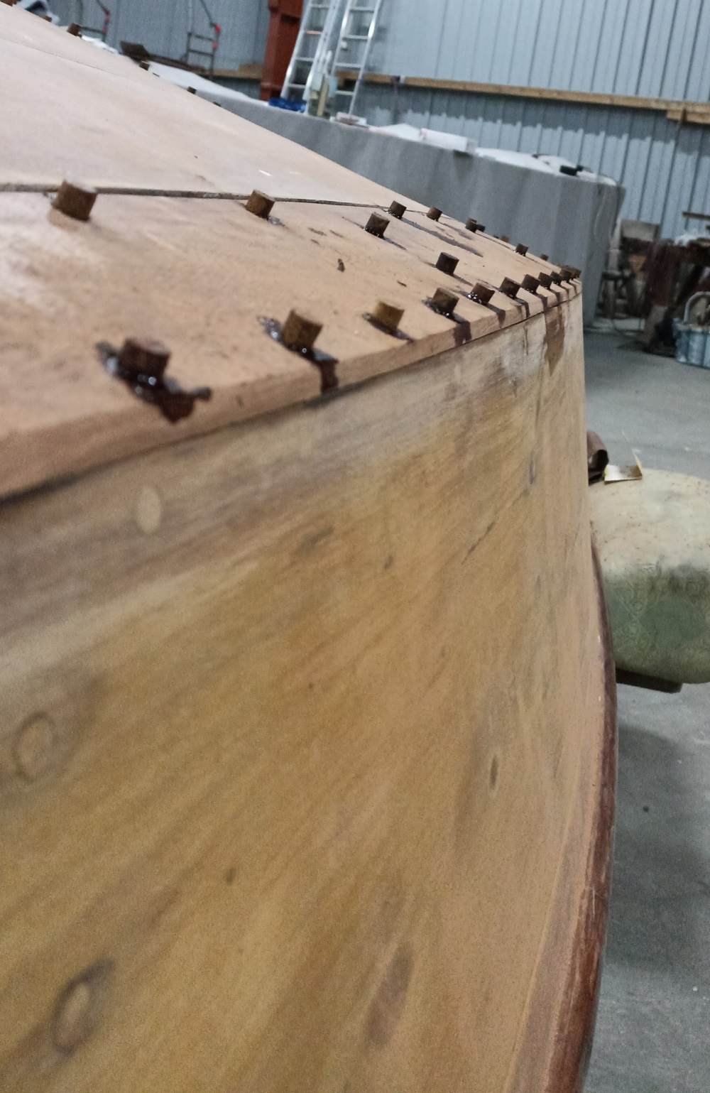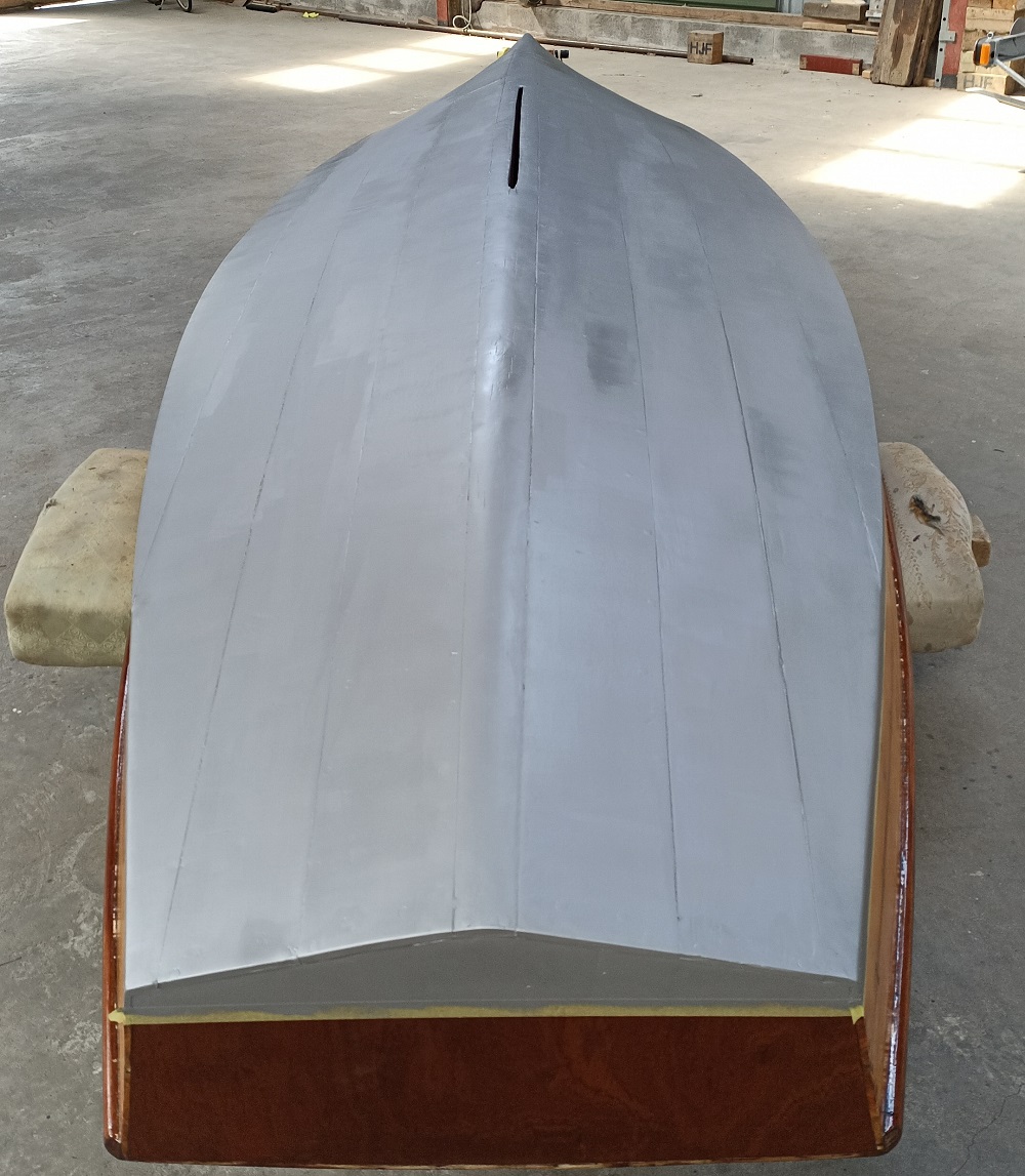G1023 Hucky - NiklasG - 07.03.2022 Hallo Holzpiratengemeinde, das Holzpiratenvirus wütet schon wieder bei mir. Letztes Jahr im Februar habe ich einen Piraten namens "Hucky" mit der Segelnummer G1023 gefunden. Ein Glück war sogar der Messbrief dabei. Das Boot wurde 1956 auf der Werft Claus Schmidt in Hamburg gebaut. Dem Vorbesitzer ist das Zelt weggeweht und so musste das Boot noch bei Schneefall gerettet werden. Der Zustand war überholungsbedürftig... ich bin kein Bootsbauer, aber man lernt auch aus seinen Fehlern. Dieses Jahr wird das Boot 66 Jahre alt, damit fängt ja das Leben an, so heißt es. Mal schauen, ob ich Hucky zum Festival schon mitbringen kann, das dauert immer alles länger als geplant ...Es ist mir bereits gelungen den 2. Eigner lt. Messbrief zu kontaktieren. Wir haben uns schon getroffen und er brachte mir auch gleich eine große Platte Bootsbausperrholz für den neuen Heckspiegel mit, da der vorige einfach rott war. Damit müsste das Boot nun den 3. oder vielleicht auch den 4. Heckspiegel erhalten, so erfuhr ich, dass der Ruderbeschlag mal aus Versehen an der Nordbake rausgerissen ist, aber das hat reviertechnische Hintergründe ![]() Auch habe ich schon eine Vielzahl alter Fotos zu dem Boot erhalten und sehe nun, wie es sich im Laufe der Jahre verändert hat, wirklich spannend. Darüber habe ich mich sehr gefreut! Ich fing an erstmal Deck und Freibord mit dem Heißluftfön abzuziehen, da es im Winterlager unter den Dickschiffen etwas enger dahergeht. Nun wurde der alte Heckspiegel rausgestemmt und der Neue schonmal eingesetzt. Gar nicht so einfach, weil er mit Fase nach außen eingesetzt werden musste, ohne Deck o.ä. zu demontieren. Das Boot hat kein Vollholzdeck mehr (das alte Deck war zu aufgerissen und Münzen fielen durch die Stöße), aber dafür wurde es durch ein schön verarbeitetes Sperrholzdeck ersetzt, welches ich nun gebeizt habe (war an einigen Stellen teilweise schon stark verwittert) Demnächst beginne ich zu lackieren und freue mich über den ersten neuen Glanz. Beste Grüße von der Stör Niklas mit Hucky RE: G1023 Hucky - MikeD - 14.03.2022 Gute Arbeit! RE: G1023 Hucky - NiklasG - 15.03.2022 UPDATE: Leider muss Hucky sich nun erstmal wieder bis zu den nächsten Ferien gedulden. Der jetzige Stand sind 3 Lackschichten auf dem Deck (teilweise zog der Lack auch nach der 3. Lackschicht nach Zwischenschliff noch tief ins Holz ein). Beim Freibord zog ungewöhlich wenig D1 Öl ein, wahrscheinlich wurde es früher schon ausreichend gesättigt. Wenn im Winterlager wieder Platz ist wird das Boot umgedreht und das Unterwasserschiff bearbeitet. Beste Grüße von der Stör Niklas mit Hucky G1023 RE: G1023 Hucky - NiklasG - 28.05.2022 UPDATE IIa: Operation Unterwasserschiff. Über die Feiertage wurde die Farbe des Unterwasserschiffs abgezogen und die beiden Planken neben dem Kiel herausoperiert. Für Ersatz aus Mahagoni ist nun glücklicherweise schon gesorgt. Die alten Planken waren mit Sperrholz und Polyesterspachtel oder soetwas in der Art geflickt, sie hatten Löcher und Risse. Zum Wandersegeln/Festival fertig zu werden... ein sehr ambitioniertes Ziel. Zur Not habe ich noch ein Backup. Beste Grüße von der Stör Niklas mit Hucky RE: G1023 Hucky - NiklasG - 10.08.2022 UPDATE III: Das Verbauen der neuen Planken An dieser Stelle noch einmal ein großes Dankeschön an Dieter. Er konnte die Bohle für mich aufsägen und abrichten auf 10mm. Die Mahagoni Bohle hatte 2 Löcher und konnte deshalb leider nicht ganz verbaut werden, war aber wahrscheinlich deshalb auch etwas günstiger... Es war ziemlich schwer überhaupt günstig Holz zu finden. Verzweifelt suchte ich schon nach alten Betten und Möbeln auf Kleinanzeigen. Aufgrund der fehlenden Länge blieb mir vorne nichts anderes übrig, als zwei Schäftungen zu machen und ein Stück einzusetzen. Dann fing ich an die beiden äußeren Planken lieber auch rauszunehmen, weil sie an ihren Enden kaputt waren und die Fuge zu groß, ich dachte das würde selbst die Kraft von quillendem Holz nicht mehr schaffen. Lukas zeigte mir, wie ich mit einem Holzklotz und einem Bleistift den richtigen Riss für die neuen Planken anzeichne. Diese wurden mit einer Stichsäge ausgesägt. Zum Schluss wurden dann noch kleinere Anpassungen mit dem Bandschleifer oder dem Handhobel gemacht. Um immer die gleiche Bohrtiefe für die Holzpropfen zu erreichen wurde für die Akkubohrmaschine eine Abstandshülse gedreht. Das nächste Problem war das Auffinden von passenden Schlitzschrauben. Der 2. Eigner hatte noch welche aus seiner Hucky Zeit diese reichten aus für die äußeren Planken. Bei Klein Karstadt im Ort konnte ich Schlitzschrauben 4x20mm Senkkopf in Edelstahl bestellen. Auch dieses Paket ging nahezu zur Neige. Die alte Planke als Schablone zu verwenden.. funktionierte auch bei Bohrabständen nicht so gut. Ich schätze etwa an die 300 Schrauben verschaubt zu haben. Als kleinen Trick beim Verschrauben kann man etwas Fett oder Spüli verwenden. Beim Verschrauben wurde gleichzeitig Sikaflex als Montagekleber verwendet. Anschließend wurden mit Epoxi die Propfen gesetzt. Die Verabeitungstemeratur von Epoxi musste zwingend berücksichtigt werden und verschob die Arbeiten teils auf lange Nächte. Anschließend konnten die Propfen etwas weiter oberhalb mit einem scharfen Stecheisen abgestochen werden, der Rest wurde glatt geschliffen. UPDATE IV: Kalfatern und Anstrich Nachdem alle Planken verschraubt und verklebt waren, konnte das trockene Holz mit Owatrol D1 geölt werden, dabei zogen einige Liter in das Holz ein. So genau man die neuen Planken auch angepasst hat, so sind sie nach ein paar Tagen schon wieder geschrumpft. Das Ausmaß des quillenden Holzes war für mich schwer einzuschätzen und bis zur ersten Wässerung baute sich ein Spannungsbogen auf. Ich hätte die Fugen mit Sikaflex abdichten können, entschied mich jedoch das Boot von unten traditionell zu kalfatern. Dazu wurden Baumwollfäden in Ettan+Wurzelteer gedreht und mit einem stu
