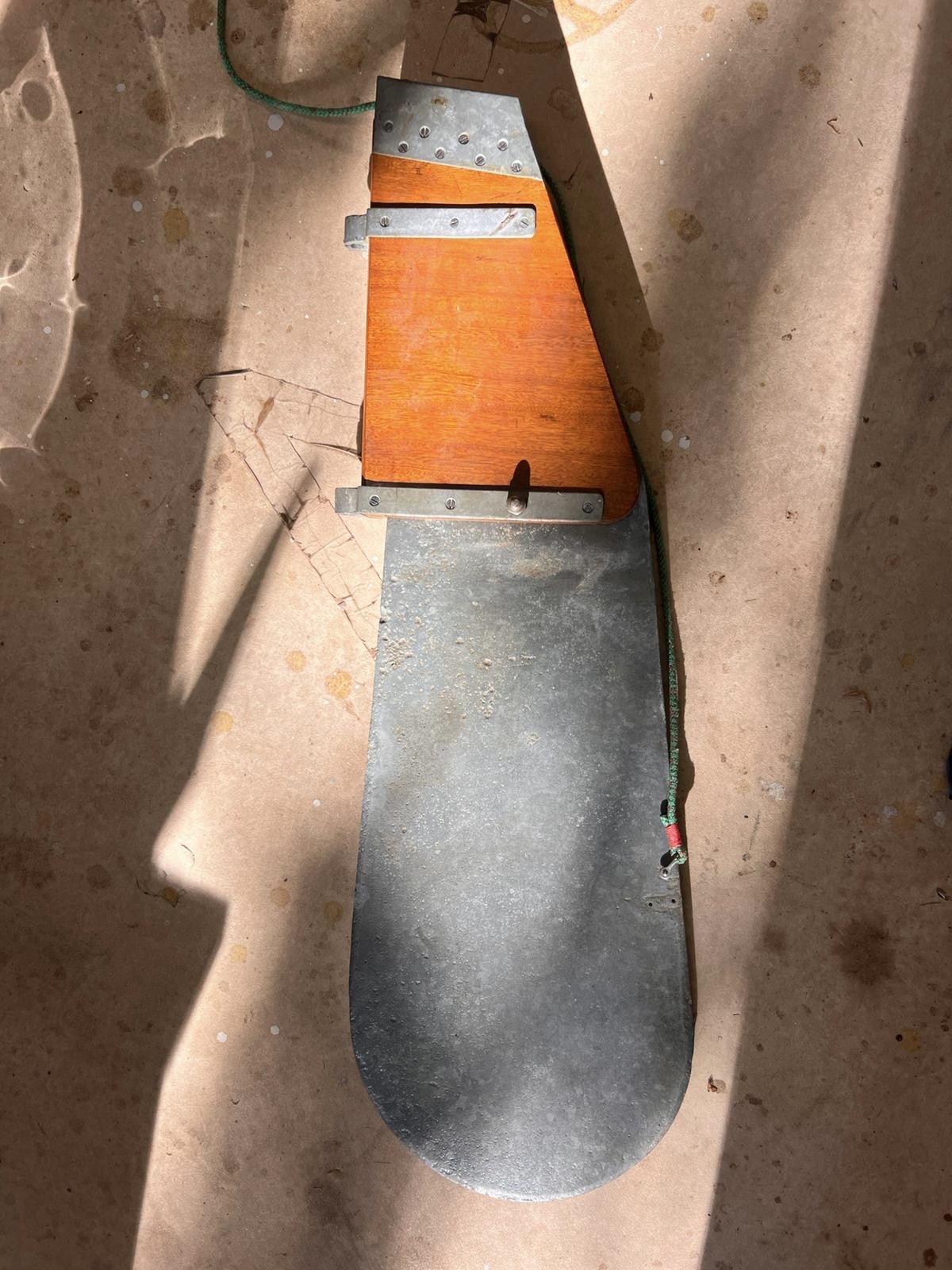 - ein hochholbares Stahlruderblatt mit Holzkopf und Holzpinne mit Ausleger