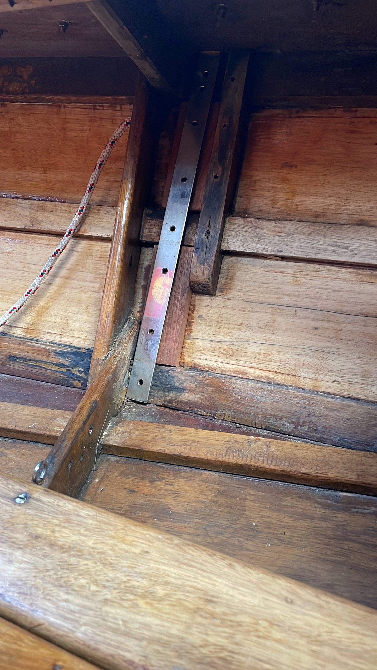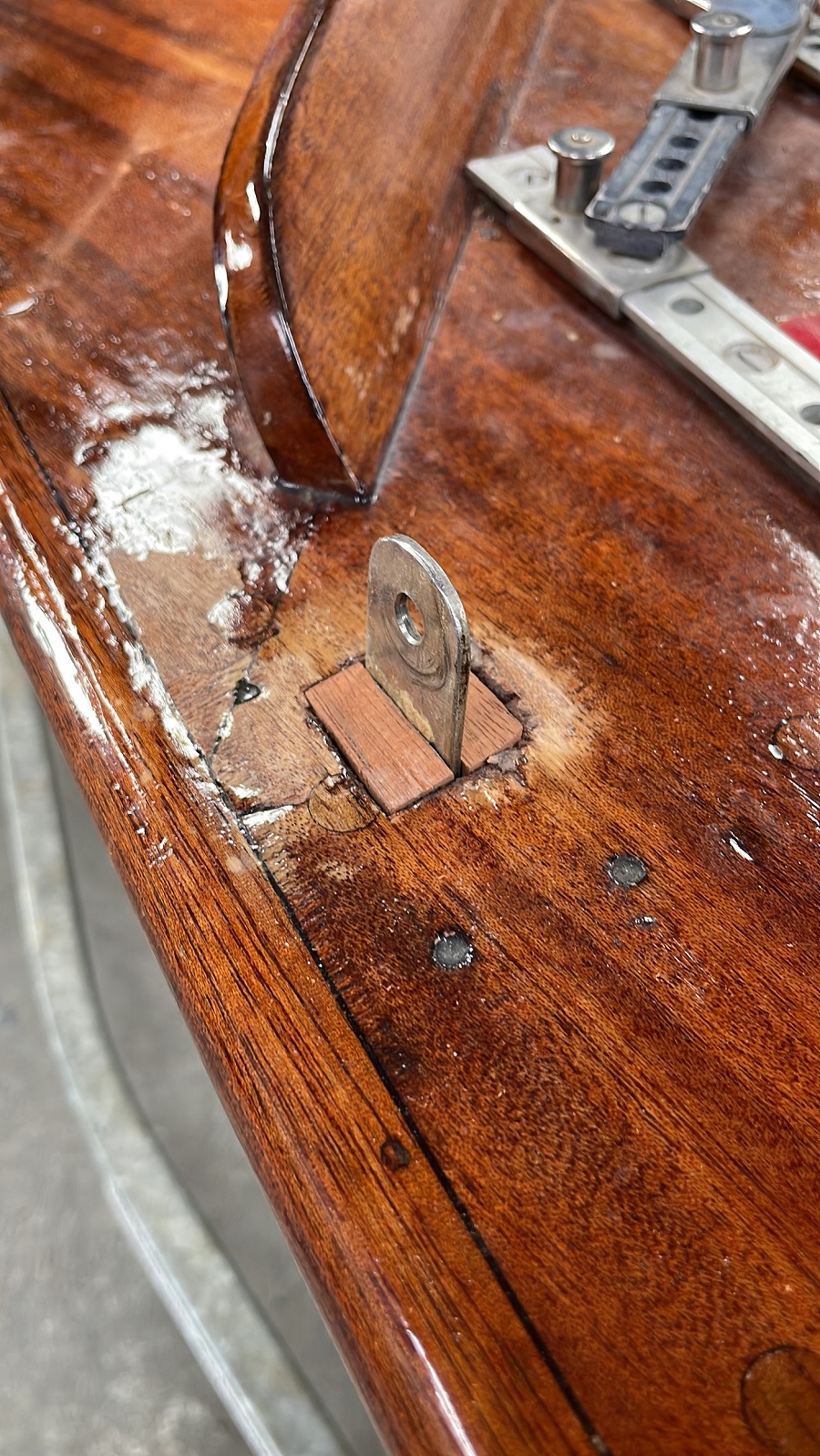 Da die Vorbesitzer das Boot mit Alu Rigg gefahren haben, wurde das Pütting umgebaut. Das Pütting wurde bis in den Kimmweger verschraubt und mit Klötzchen verklebt. Da ich es nicht kompliziert machen wollte, bin ich genauso verfahren.