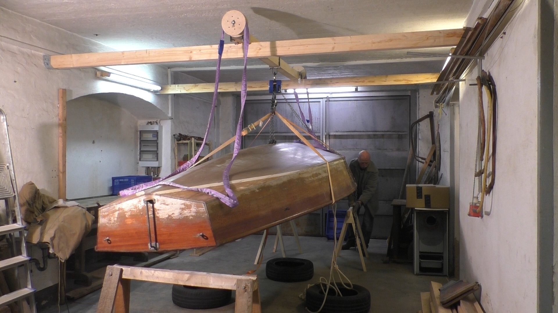 Da ich kaum Hilfe habe und die Garage nur 4 x 8 m ist, wird es mit dem Wenden des Bootes etwas problematisch.