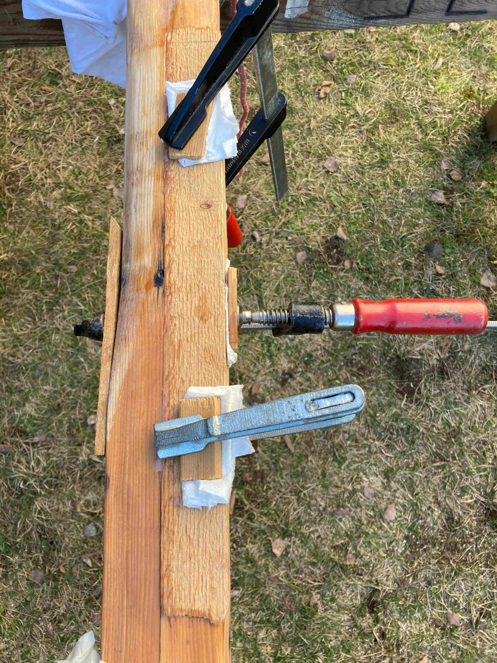 Bestärkt von meiner ersten Reparatur habe ich mich jetzt an eine Reparatur am Mast gewagt. Bei der Inspektion des Mastes ist mir eine sehr lose Schraube entgegen gekommen. im Schraubenloch nur rottes Holz... konnte ich quasi mit dem Fingernagel rauspuhlen... Ich vermute, dass hier viel Regenwasser reingelaufen ist und so das Wasser leichtes Spiel hatte...