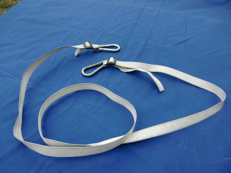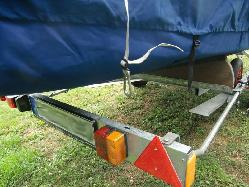 Bei so manchen Bootsanhängertypen steht die abnehmbare Lichtleiste weit nach hinten raus. Hier ist oft eine Auf- und Abschaukeln während der Fahrt zu beobachten, weswegen die Lichtleiste dagegen gesichert werden sollte bzw. muss, denn der „Leuchtenträger … darf nicht pendeln“ (siehe auch §49a (9) StVZO Punkt 3: Anhängern zur Beförderung von Booten). Hier hat sich bei mir ein Jalousiegurtband bestens bewährt. Genau auf die richtige Länge (mit etwas Spannung) mit zwei Schnappschäckeln eingestellt, ist das Hochbinden der Lichtleiste mit einem Griff schnell erledigt. Das breite, reckarme Gurtband hat zudem den Vorteil, dass die Auflage breit ist und so keine Druckstellen (wie etwa ein Seil) im weichen Holzdeck verursacht. Die festgelegte Länge (knapp, Lichtleiste auf Zug hoch gebunden) erfordert kein Nachspannen mehr wie dieses bei Spanngurten mit Ratsche der Fall ist. Das oft zu beobachtende Vibrieren von Spanngurten durch den Fahrtwind (und die damit einhergehende vorzeitige Materialermüdung) vermeidet man durch mindestens eine halbe Verdrehung des Gurtes in sich selbst.