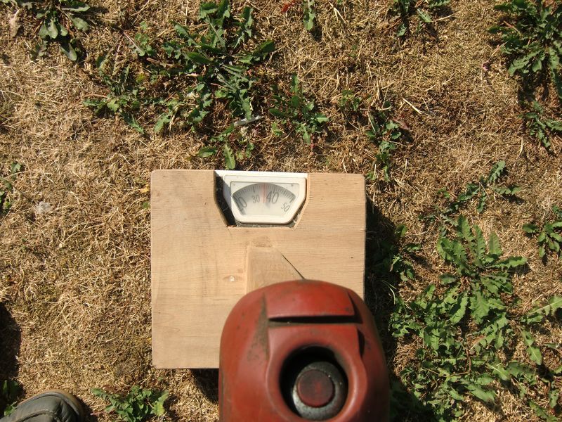 Zur Lastkontrolle verwende ich eine alte Personenwage aus dem Sperrmüll, welche ich um diese einfache Holzkontruktion erweitert habe zur Aufnahme der Hängerkupplung.